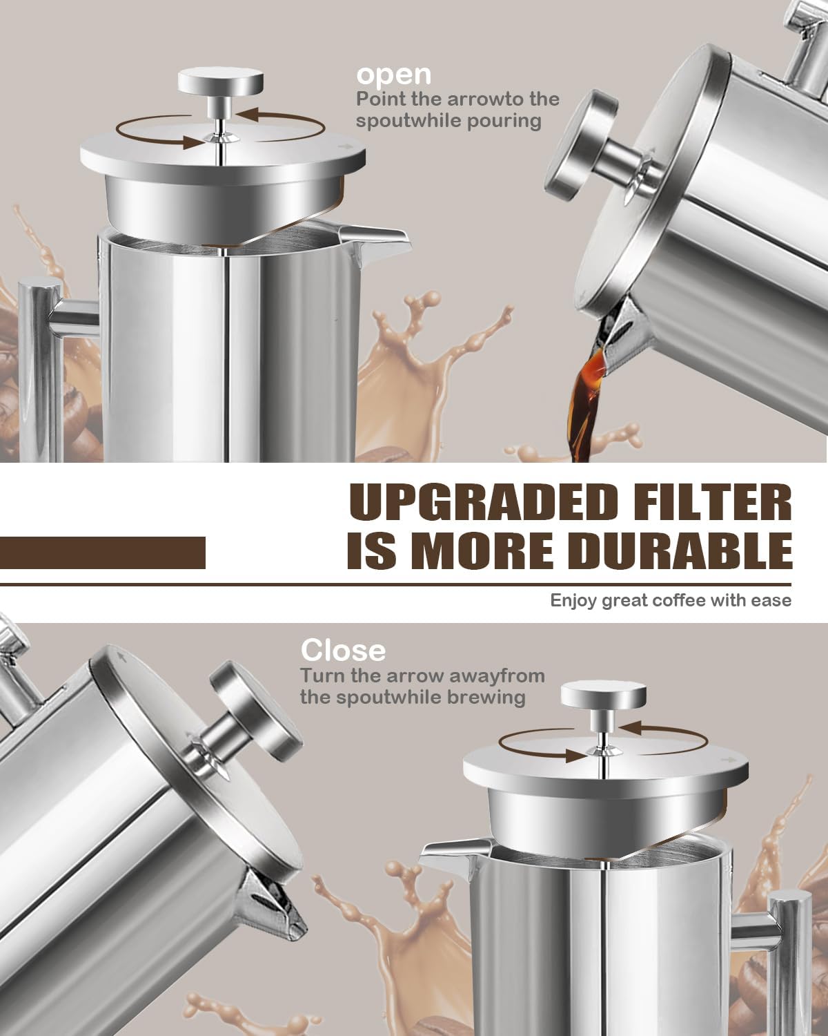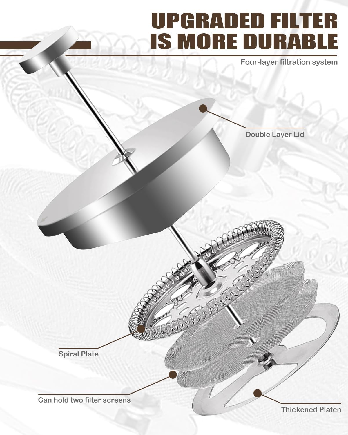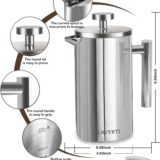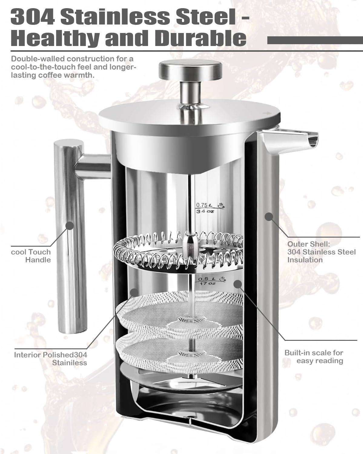 Featuring precise scale lines, this French press allows you to measure your coffee and water accurately, ensuring a perfect brew every time. The double-walled construction keeps your coffee hot while remaining cool to the touch, providing a safe and comfortable grip. Plus, with two extra filters included, you can enjoy a smooth, grit-free cup of coffee without the hassle of frequent replacements.